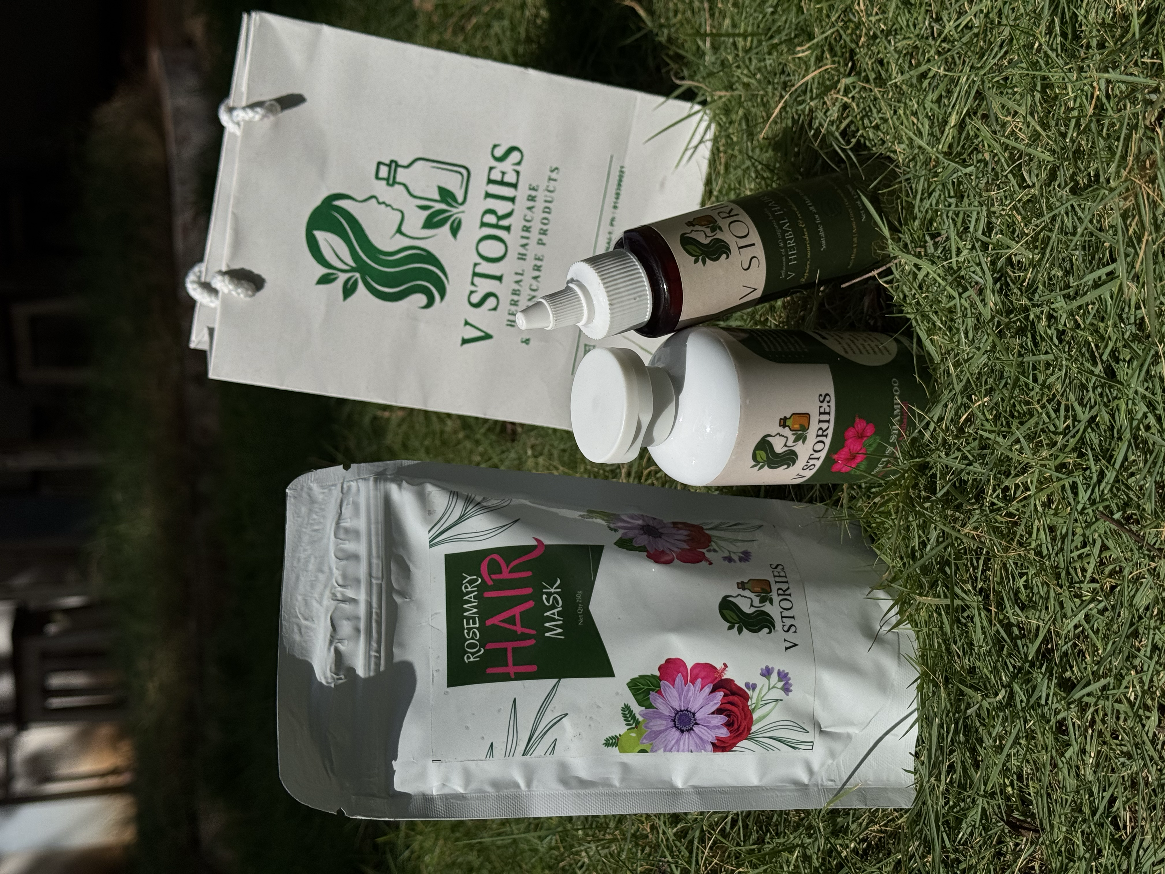 The comprehensive hair solution: V Herbal Hair Oil, Hibiscus Shampoo, and Rosemary Hair Mask. Restore, cleanse, and condition in one go.